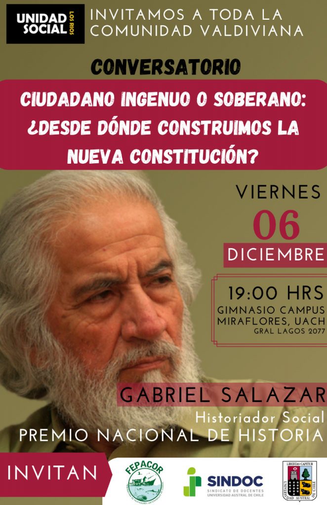 En una transmisión desde el gimnasio Campus Miraflores UACh, se realizó el conversatorio: «Ciudadano ingenuo o ciudadano soberano, ¿desde dónde construimos la nueva constitución?», dicha actividad contó con la participación del Historiador y premio nacional de historia Gabriel Salazar.